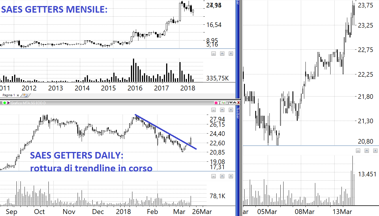 SAES GETTERS. Ottimi i volumi di oggi e ha rotto una lunga trendline discendente, se uncina si può valutare.