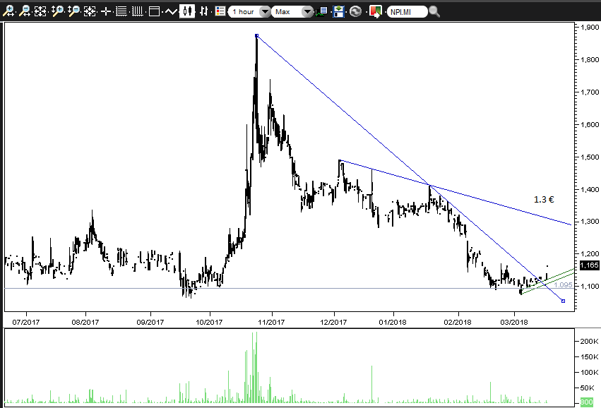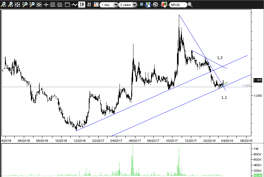 Abbiamo corredato il grafico di una eventuale parallela che potrebbe formarsi ma ancora non validata che, come indicazione ci dà un valore limite di supporto di 1.1 € per azione e un target di 1.3 € per azione.