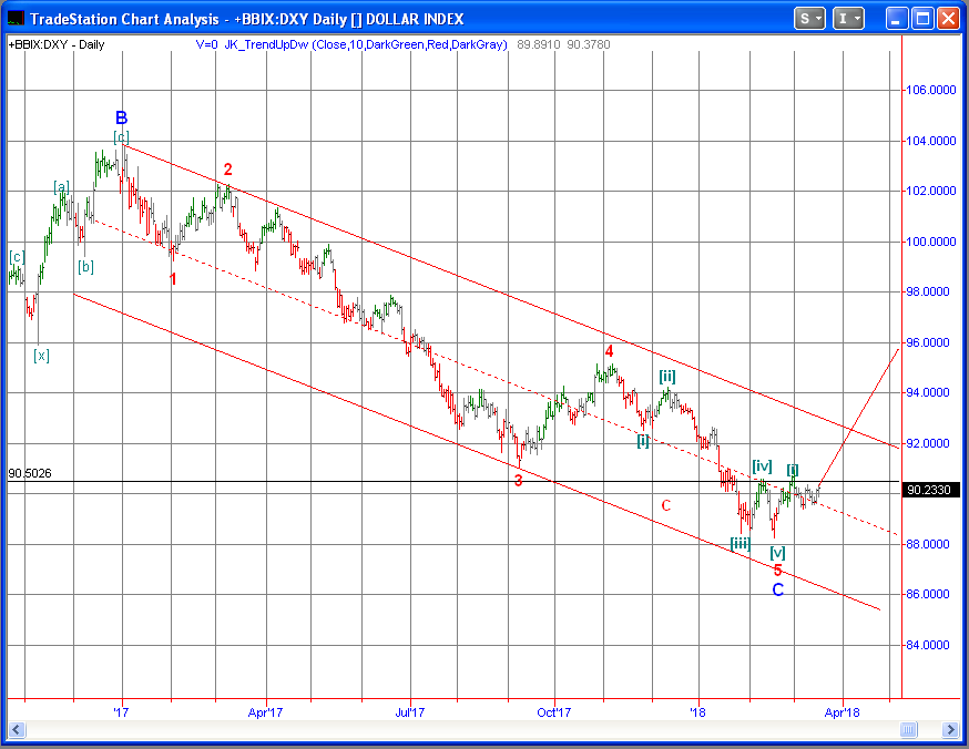 I rendimenti del trentennale amerciano, venderdì hanno registrato un minimo al 3,04% ed ora la struttura d’onda dell’onda [iv] potrebbe essere completa. Il prossimo rally di onda 5 porterà i rendimenti ben al di sopra del precedente massimo del 3,234% del 21 febbraio. Potrebbe comunque essere necessario un ulteriore ritocco del minimo di questa settimana prima di dare il via all’onda 5. La partenza dell’onda 5 sui rendimenti comporterà una discesa dei prezzi del trentennale che a questo punto potrebbe non fare il triangolo che si ipotizzava qualche settimana fa e portare i prezzi che ora orbitano in zona 145 a 141 o anche sotto.