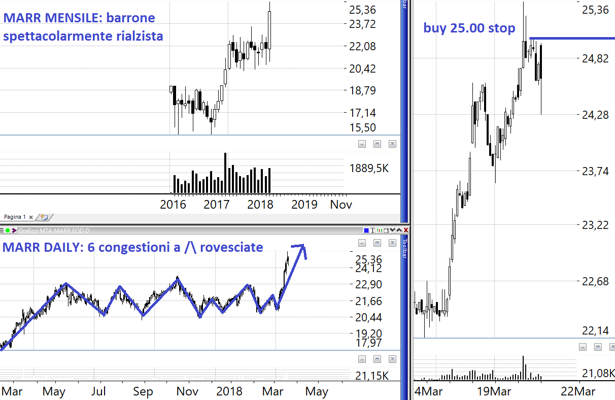 MARR: è da prendere. Da giorni aspettiamo che ce ne dia l’opportunità ma vola su dritta come un missile. Stamattina in apertura ha accennato ad uno sciacquone subito riassorbito. Guardate come è bella: c’era una congestione orizzontale con tanto di trappola per tori, ha fatto sei /\ rovesciate e poi in un giorno ha rotto tutto e si è posizionata in area rialzista con un balzo solo. E noi a guardare perché non ha accennato un benché minimo ritracciamento. Siamo costretti a compare oggi alla baionetta: buy MARR 25.00 stop.