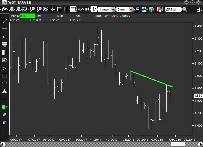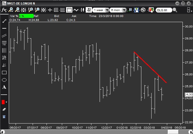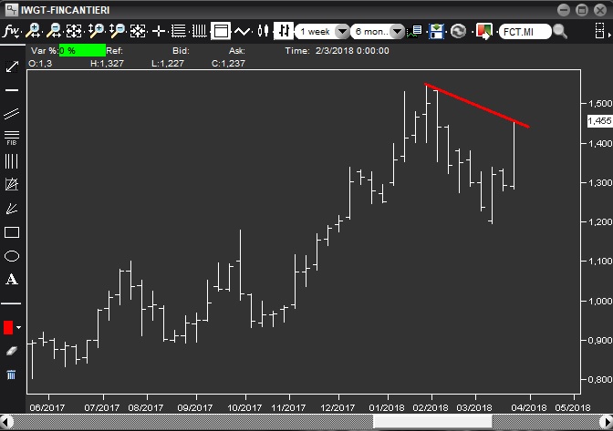 Il grafico non è pulito, dal momento che il massimo da cui trae origine la trendline appartiene ad una barra che è contenuta (insieme a molte altre prima di lei) in un'altra barra che risale al novembre scorso, ma penso valga comunque un tentativo.