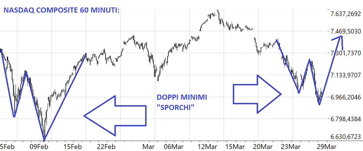 Noto un po’ di nervosismo in giro e anche il sottoscritto stamattina non era proprio di buon umore. Ho aspettato a scrivere perché come sempre a bocce ferme risulta tutto più facile. Dunque il nostro mercato azionario chiude sui massimi e Wall Street balla sul burrone. Allora uno deve ragionare su a cosa dovrebbe assomigliare un rimbalzo. Tipicamente Wall Street ha due modi per rimbalzare: la ripresa a V o il doppio minimo. E anche nella odierna fattispecie abbiamo quello che è il doppio minimo “sporco” esattamente come a febbraio scorso ovvero l’indice rompe il minimo della prima V e poi risale velocemente dopo aver mangiato i sell stop dei venditori nella più classica delle trappole per Orsi. Posto di seguito la figura di quello che sta succedendo e francamente mi sembra che i due casi siano davvero simili. Quindi nessun panico finché Wall Street regge e finché il Ftse All Share rimane dentro il canale orizzontale siamo sempre e comunque al rialzo.