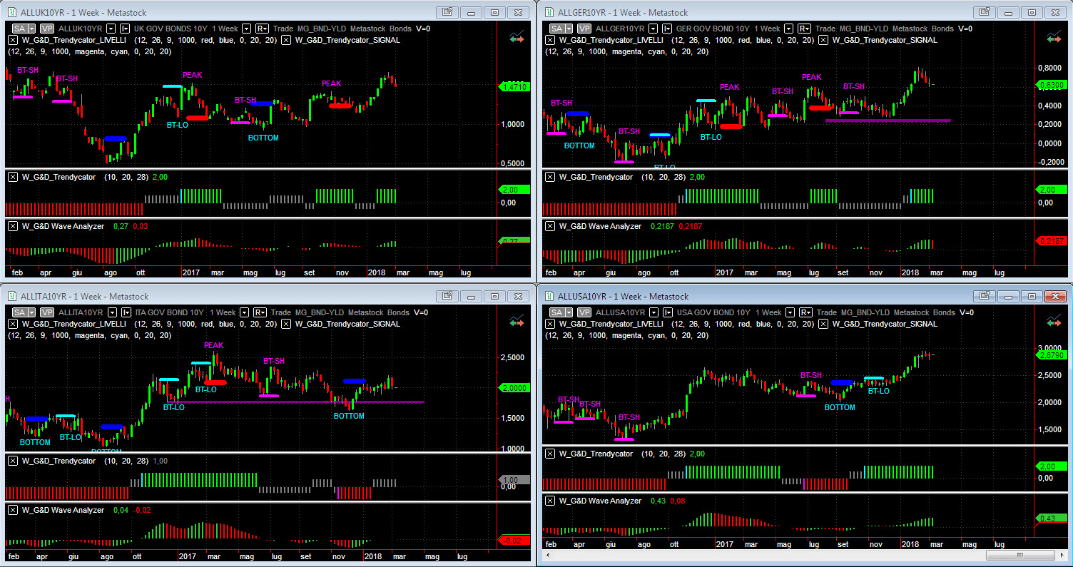 Osservando – a livello di analisi integrata – le curve dei rendimenti dei benchmark decennali dei principali mercati – nonostante la modesta discesa dei rendimenti osservata – rimane stabile l’impostazione generale, confermando quindi il probabile nuovo corso dell’obbligazionario. Il modello Trendycator si mantiene quindi saldamente LONG sia sull’area UK sia sull’area BUND: l’area UK passa da area 1,60% ad area 1,50% ma Trendycator rimane verde, il Bund torna sotto 0,70% dopo il balzo delle settimane scorse, ma anche in questo caso nessun tentennamento da parte di Trendycator. Di fatto in laterale il nostro Btp che torna nella parte bassa del range 2%-2,20% e Trendycator che prosegue nella sua zona neutrale, sempre in attesa di confermare il BOTTOM realizzato a fine 2017. L’area USA, ormai da tempo avviata al “nuovo corso” vede l modello Trendycator sempre verde (ormai da oltre 20 settimane) con i rendimenti che hanno raggiunto il target psicologico di area 3,00% per poi ripiegare un po’.