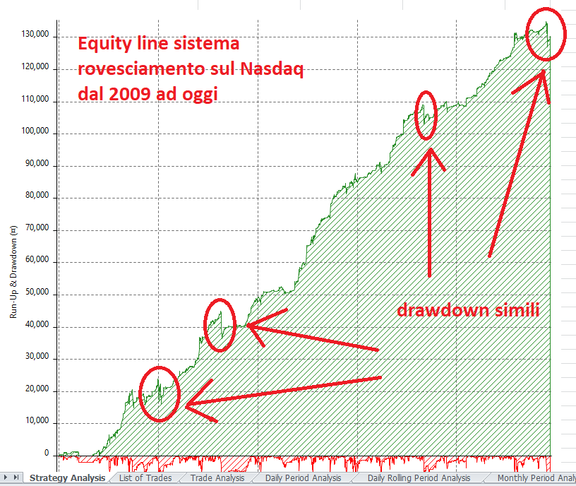 Veniamo quindi al Nasdaq: un lettore lamenta di avere perso. Certo, fa parte del gioco e posto di seguito la equity line del Nasdaq per quanto riguarda questo tipo di trading in contro tendenza. La equity deve essre considerata largo circa sia perché gli eseguiti dei lettori non sono quelli nostri sia perché i dati nostri non sono quelli del flusso dei lettori. Nella prima figura avete appunto largo circa lo storico e notate come il drawdown avuto recentemente, per quanto doloroso, è tutto sommato “normale”. Tenete inoltre conto che se vedete un drawdown, in una equity che dal 2009 arriva ai giorni nostri, è diverso da una equity che parte due anni fa dove il drawdown può assumere falsamente contorni giganteschi: