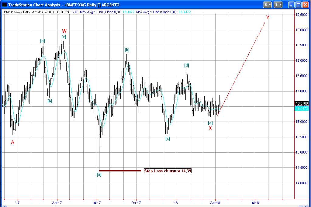 Se il wedge che si è formato sul ratio Silver/Gold esce dalla parte superiore prevediamo un periodo in cui a prescindere dalla direzione dei due metalli l’argento potrebbe mostrare maggior forza relativa sull’oro, quindi chi volesse aprire una posizione in spread dovrebbe andare long sull’argento e short sull’oro aprendo due posizioni del medesimo importo e di segno contrario.