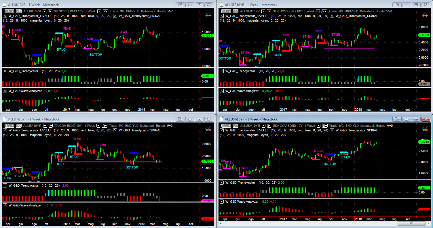 Osservando – a livello di analisi integrata – le curve dei rendimenti dei benchmark decennali dei principali mercati continuano a non intervenire modifiche sostanziali all’impianto generale. Il modello Trendycator, infatti, è sempre LONG sull’area UK e rimane neutrale sull’area BUND, nonostante il rimbalzo messo a segno: l’area UK torna rimane stabile in area 1,40%, mentre il Bund strappa e raggiunge area 0,60%, seppur con Trendycator in posizione neutrale (grigio). Poco o nulla cambia per il nostro Btp che prosegue la sua lateralità tra 1,70% e 1,80% ma ora con Trendycator in zona rossa, mettendo in “pericolo” l’eventuale conferma del BOTTOM realizzato a fine 2017. L’area USA prosegue il consolidamento del rialzo dei rendimenti che ha toccato area 3% a febbraio scorso, portandosi ora sopra a 2,90% di rendimento con il modello Trendycator sempre impostato al rialzo.