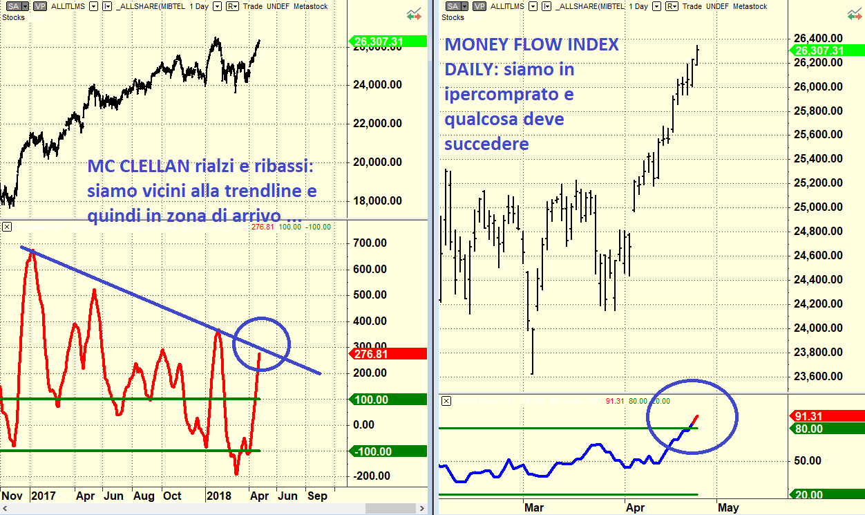 La belva ha girato. Complice la chiusura pesante di Wall Street notiamo nel grafico che segue che il Money Flow Index ha raggiunto la zona di ipercomprato (è diventato rosso) mentre il Mc Clellan sta toccando la trendline discendente.