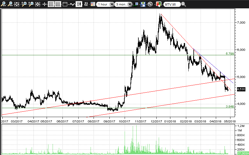 Attualmente la configurazione la conduce eventualmente ad appoggiarsi ad una parallela che la porta sui 4,39 € per azione e in caso di invalidazione di tale parallela, vedrà configurarsi area 3,85€, zona in cui aveva trovato una lunga stasi per tutto il 2017. Viceversa al superamento del valore di 4,93 € si riaprirebbero scenari positivi che potrebbero condurre il recupero sino all'area vicina ai 6 €.