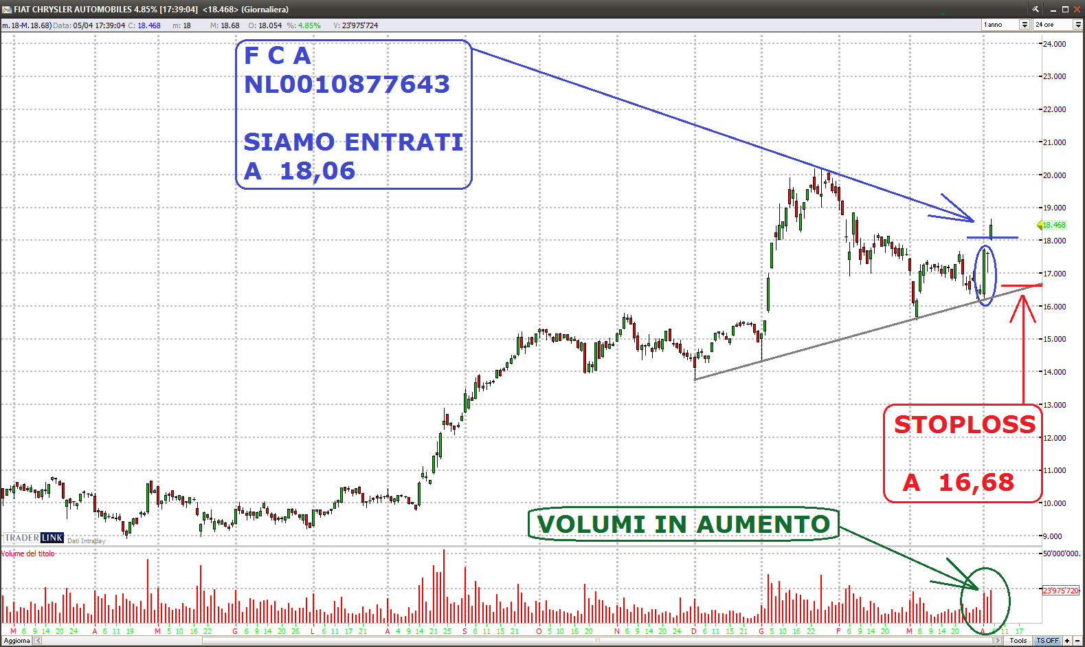 Infine uno sguardo al nostro portafoglio azionario nel quale in ossequio alla maggiore forza relativa del nostro indice e alla forte inversione degli indici USA, abbiamo deciso di acquistare tre titoli italiani (ERG, FCA, POSTE ITALIANE) ed un quarto (EL.EN.) in attesa di essere infilzato, e come sempre……..sperem!!