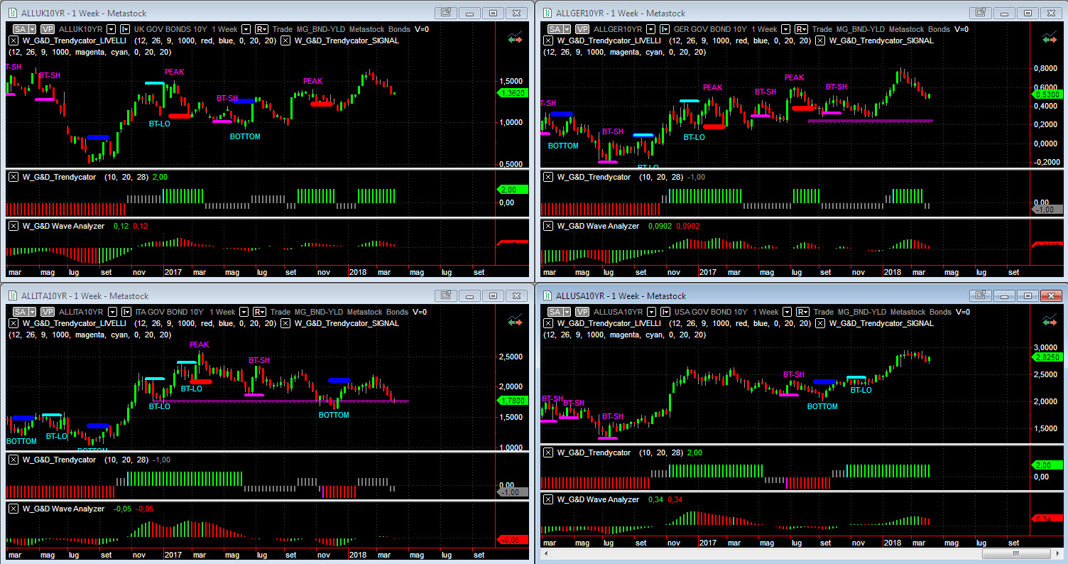 Osservando – a livello di analisi integrata – le curve dei rendimenti dei benchmark decennali dei principali mercati non sono intervenute sostanziali modifiche all’impianto generale, salvo un cambiamento sul Bund. Il modello Trendycator, infatti, si mantiene LONG sull’area UK ma torna neutrale sull’area BUND: l’area UK scende in area 1,36% senza modificare l’impostazione di Trendycator che rimane verde, mentre il Bund consolidando in area 0,50% ma senza modifica l’impostazione di Trendycator che è ora in posizione neutrale (grigio). Non cambia nulla per il nostro Btp che rimane sotto 1,80% di rendimento e Trendycator sempre in zona neutrale, non ancora in grado di confermare il potenziale BOTTOM realizzato a fine 2017. L’area USA prosegue il consolidamento del rialzo dei rendimenti che ha toccato area 3%, restando a ridosso del 2,80% di rendimento con il modello Trendycator sempre impostato al rialzo.