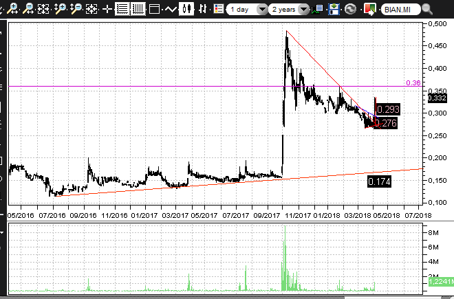 Nell'ultima seduta di borsa, è stata superata con gran forza la trendline ribassista costruita dai massimi dell'Ottobre 2017 avvenuta al valore di 0,295 € per azione.