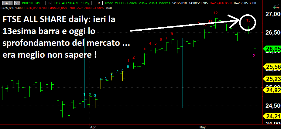 Invece la frittata è stata fatta con il fattore NAZIONALE: lo spettro di un governo “confuso” in economia sta mandando in fibrillazione i mercati e ha fatto sprofondare il nostro indice. Mi spiace dover constatare che ancora una volta il Sequential ha avuto ragione, tanto più che la barra del fine corsa di 13 è magicamente arrivata proprio ieri. Ovviamente sarebbe molto meglio potervi dire che il Sequential non funziona …