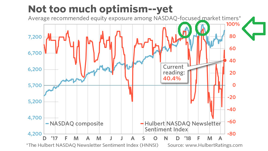 Mark Hulbert certinosamente tiene un indice che è unico nel mondo ovvero il Hulbert Nasdaq Newsletter Sentiment Index per acronimo HNNSI. Ovvero quando i tanti Tomasini pennivendoli che seguono il Nasdaq sono rialzisti allora il Nasdaq scende e viceversa quando sono ribassisti invece sale. Fatto da un pennivendolo come Mark Hulbert (non può negare che appartiene alla categoria) è una stoccata forte anche se ti fa piacere perché io in questo momento sono ribassista perché tutto sale e quindi sono dalla parte giusta del mercato.