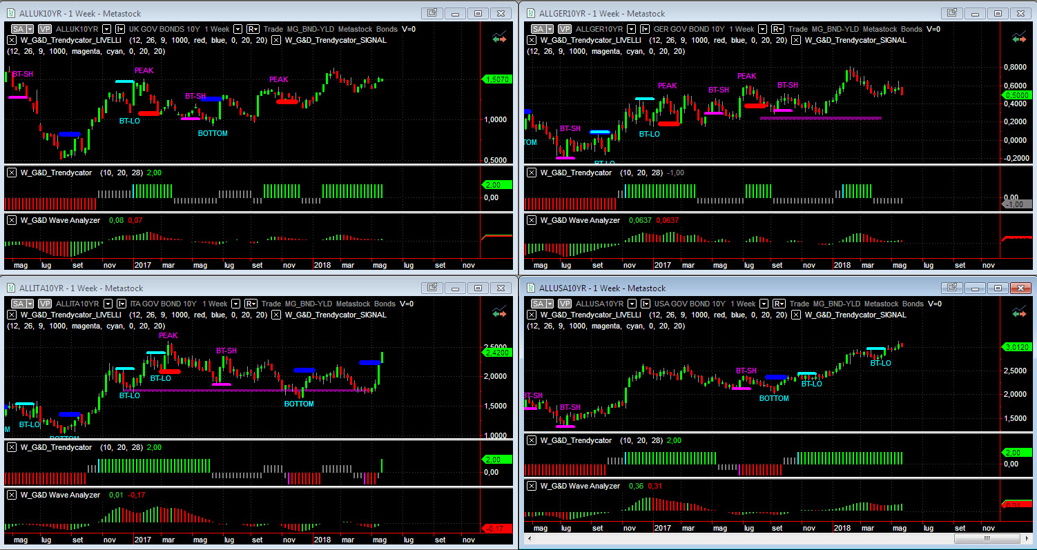 Osservando – a livello di analisi integrata – le curve dei rendimenti dei benchmark decennali dei principali mercati il mercato risulta di fatto stabile a parte l’Italia che a seguito delle recenti vicende modifica l’impostazione del modello di analisi. Trendycator, rimane LONG sull’area UK e rimane neutrale sull’area BUND: l’area UK si porta in area 1,50%, mentre il decennale tedesco coregge verso area 0,50% – probabile conseguenza delle tensioni che lo rivedono bene “rifugio” – lasciando inalterato (grigio) il modello Trendycator. Rimbalza con forza il rendimento del nostro Btp che supera di slancio area 2,00% portandosi oltre 2,30% di rendimento e facendo scattare il LONG su Trendycator (verde) e quindi confermando (a distanza di diversi mesi) il BOTTOM realizzato a fine 2017. L’area USA, dopo una fase laterale, riprende la via del rialzo e si porta stabilmente sopra area 3% con Trendycator sempre saldamente impostato al rialzo.