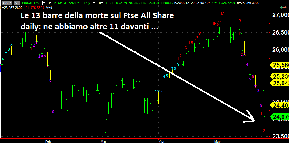 Quanto sarà pesante questa punizione non ve lo so dire, già oggi diciamo che non scherzava. Il conteggio del Sequential ha visto un Set Up rialzista andato in fumo e quello che è peggio un 1-2 del conteggio ribassista di 13. Con altre 11 barre di ribasso corriamo il rischio di vedere sfondato l’ultimo dei 3 supporti indicati illo tempore, quello di 23.623 del Ftse All Share ovvero lo scenario catastrofico del dopo elezioni.