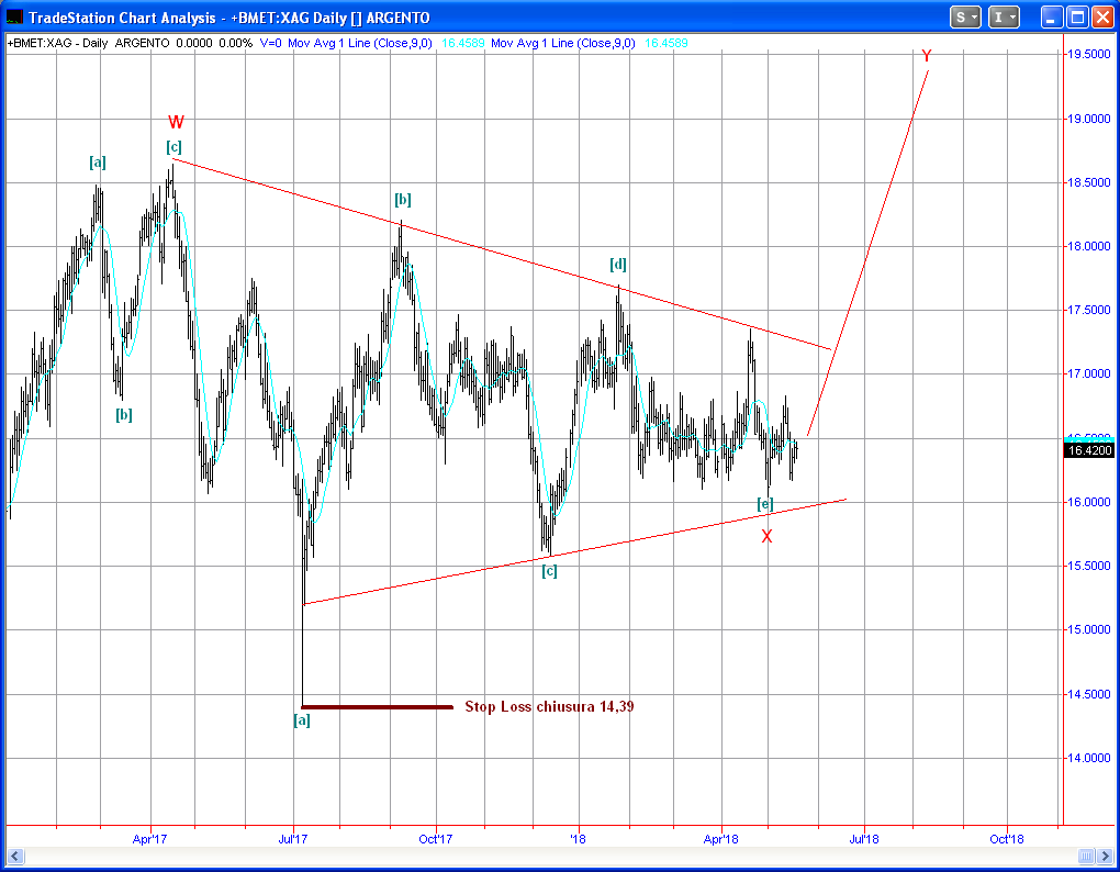 Situazione uguale e contraria sull’Euro sul quale vediamo all’opera la stessa onda 4 ma in senso opposto.