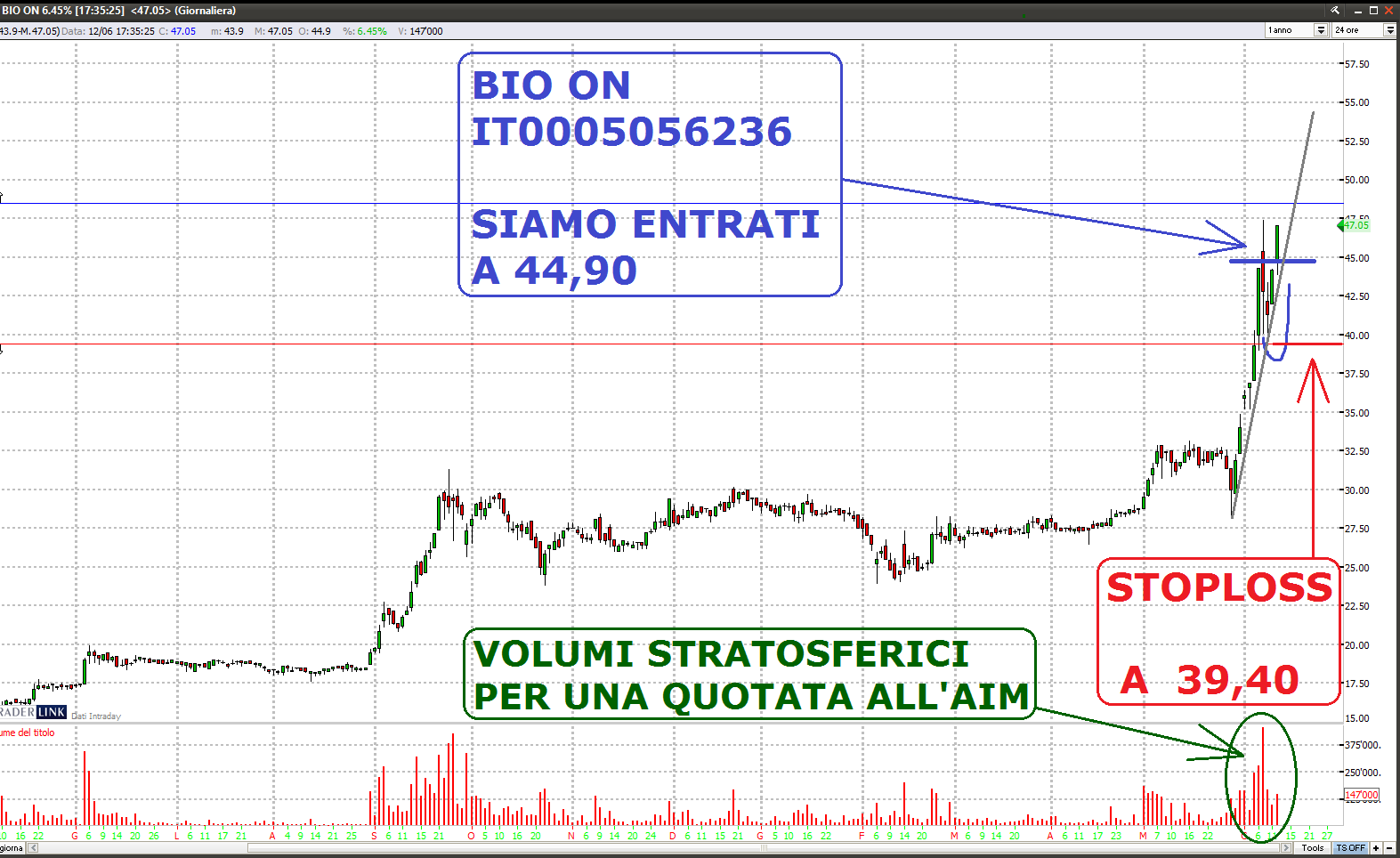 Infine uno sguardo al nostro Portafoglio azionario nel quale, oggi, sono ritornati gli acquisti sul mercato italiano anche se in forma molto limitata così come spiegato dal Dott. Tomasini nel suo articolo di ieri notte, ed è sintomatico il fatto che ci siamo rivolti al mercato AIM, mercato sempre molto effervescente anche se impossibile da consigliare con BUY ufficiale visti i volumi bassi sviluppati delle matricole, ma l’azione BIO ON con un controvalore scambiato ieri di 4.200.000 € ed oggi con 6.701.000 €, ci ha dato questa possibilità.