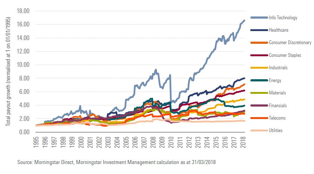 Nel breve periodo, intanto, gli investitori che puntano ai dividendi possono essere felici. Secondo uno studio di Janus Henderson quelli a livello globale nel 2018 ammontano a oltre 13 mila miliardi di $, il 6% in più rispetto al 2017. Merito anche del +10,2% fatto segnare nel primo trimestre dell’anno ed evidenziato dall’andamento del Janus Henderson Global Dividend Index. “L’economia globale è in crescita e i profitti aziendali aumentano generando ricchezza che le società restituiscono ai loro azionisti”, hanno spiegato i curatori del report. A dare il passo sono soprattutto Canada e Stati Uniti: il primo con un aumento del payout del 13,8% e il secondo con un progresso del 13,7%. La crescita in nord America è dovuta soprattutto al contributo delle società tecnologiche, finanziarie e del comparto salute. Quest’ultimo d’altra parte proprio nella ricerca di Mornigstar si colloca al secondo posto.