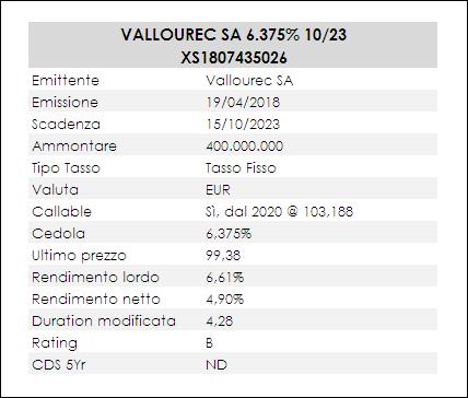 La società francese Vallourec è specializzata nella produzione di tubi per gasdotti ed oleodotti senza saldature, di fatto gemella della nostra Tenaris; al pari di altre aziende produttrici di tubi, legate all’andamento del mercato dei prodotti petroliferi, è un’emittente a rischio poiché soffre sia a causa della stagnazione della domanda mondiale sia a causa dei dazi americani imposti dall’amministrazione Trump sulle importazioni di manufatti di alluminio e acciaio negli Stati Uniti. La società capitalizza 2,2 Mld Euro e lo scorso anno ha realizzato un giro d’affari pari a 3,75 miliardi. Il debito di gruppo tuttavia si è alzato a 1,54 Mld Euro per cui l’emittente è potenzialmente a rischio per quanto concerne le valutazioni delle agenzie di rating.