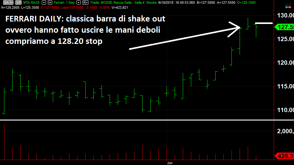 Ebbene oggi l'occasione è arrivata con Ferrari, titolo sui massimi storici, che ci ha regalato una bellissima barra di shake out ovvero hanno scosso il pero e fatto cadere le mani deboli.