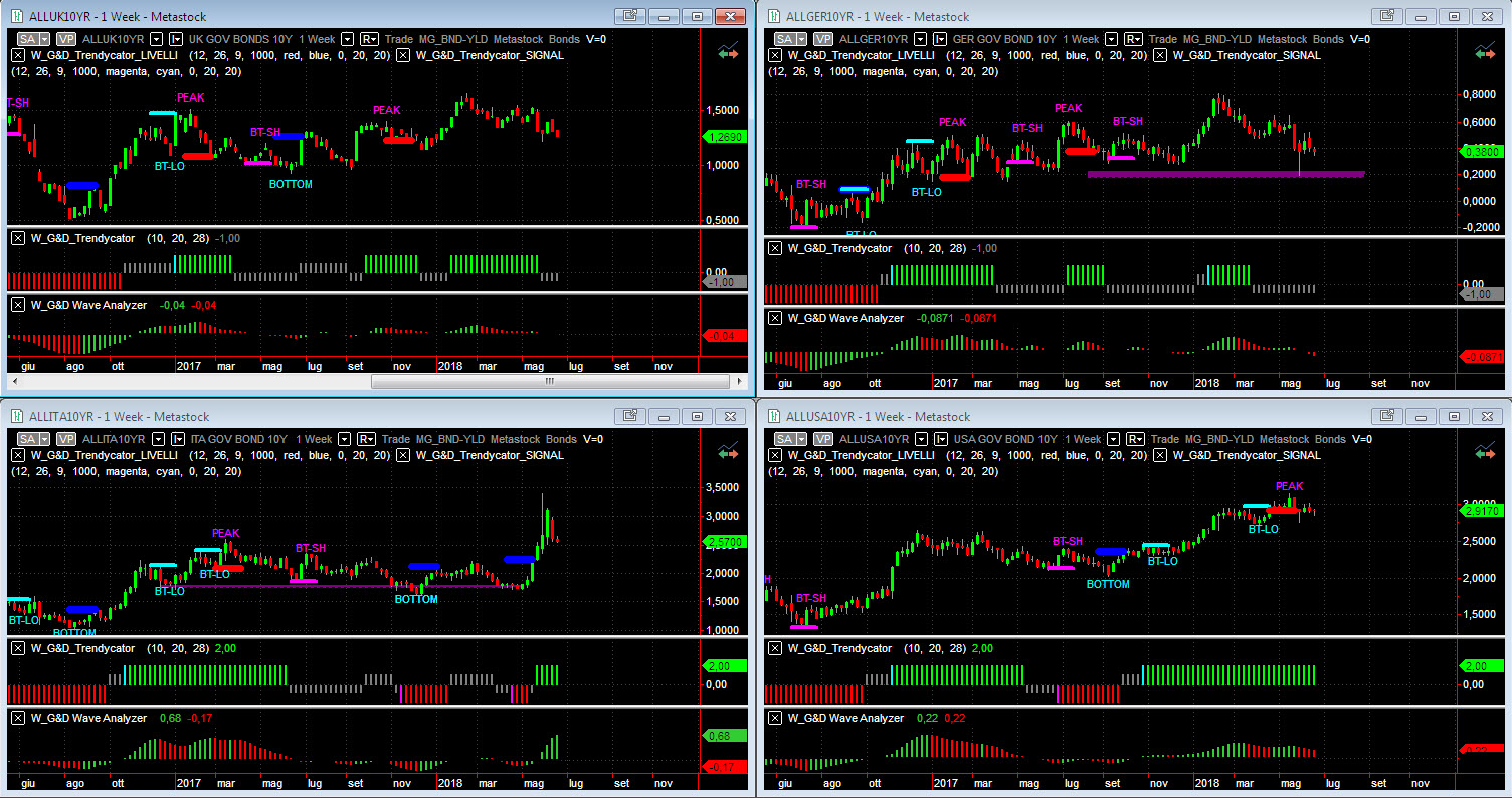 Osservando – a livello di analisi integrata – le curve dei rendimenti dei benchmark decennali dei principali mercati la situazione di medio/lungo rimane invariata. Trendycator resta NEUTRAL sull’area UK e si conferma NEUTRAL anche sull’area BUND: l’area UK infatti ritorna sotto area 1,30%, mentre il decennale tedesco si riporta in area 0,40%. In contrazione il rendimento del nostro Btp che torna sotto area 2,70% e conferma l’impostazione LONG di Trendycator (verde) per la quinta settimana consecutiva. Prosegue anche il consolidamento per l’area USA, che continua lateralizzare intorno ad area 3% e con Trendycator sempre saldamente rialzista.