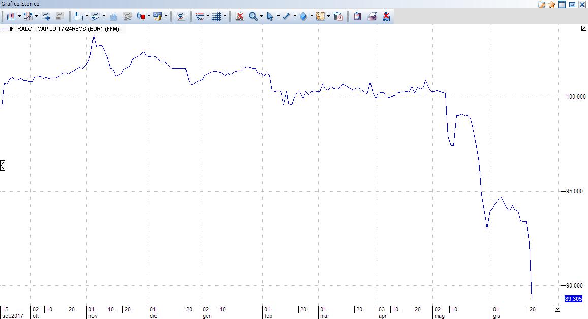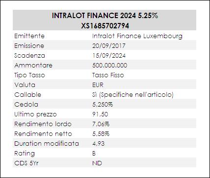 Il bond HY che analizziamo oggi è in circolazione da fine 2017: emesso da Intralot per un ammontare di 500 Mln Euro, paga cedola annuale del 5,25% su base semestralmente e quota oggi sul mercato OTC in area 91,50 con lotto minimo 100.000 Euro. L’emissione è stata finalizzata sia all’estinzione di debiti bancari (165 Mln Euro) sia al rimborso anticipato della precedente emissione HY (esercizio call) al 6,75% e scadenza 2021 (250 Mln Euro).