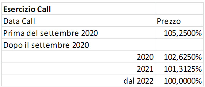 Complessa la struttura dell’opzione call a favore dell’emittente, di cui mettiamo qui uno schema riassuntivo, premettendo che l’emittente ha facoltà di richiamo anticipato in qualsiasi momento, per l’intero ammontare del prestito o per una sola parte.