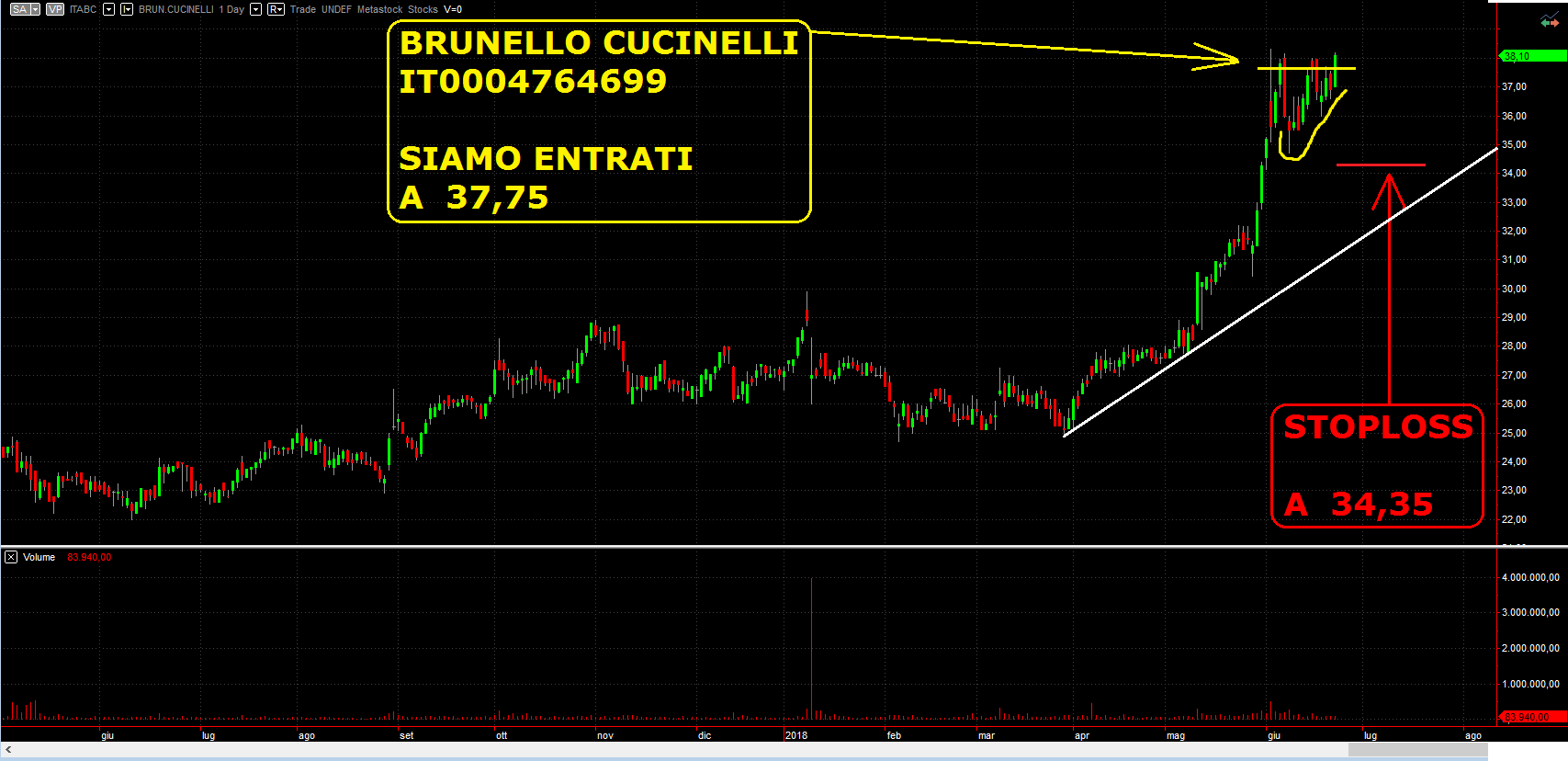 Infine diamo uno sguardo al nostro Portafoglio azionario nel quale, ieri, siamo entrati in acquisto sull’azione BRUNELLO CUCINELLI dopo vari tentennamenti, mentre per quanto riguarda il NASDAQ100 in modalità Breakout registriamo la vendita in STOP sull'azione MICROCHIP.