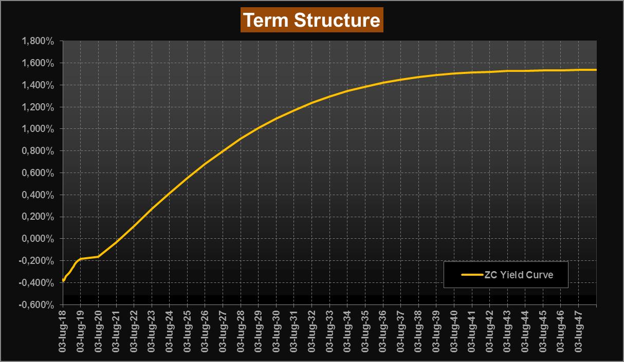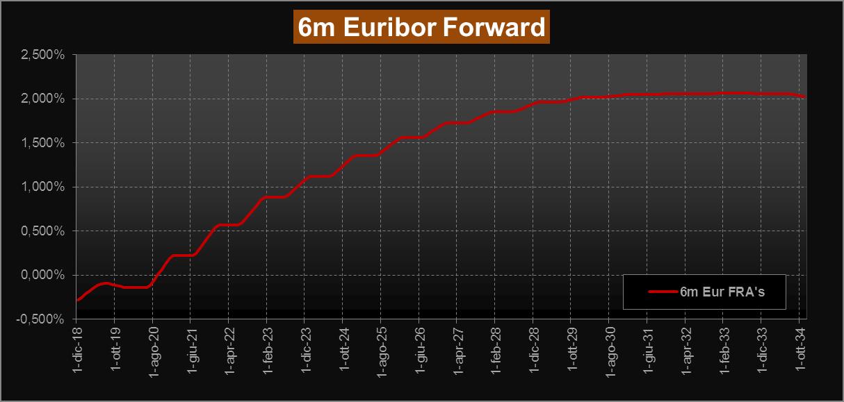 La nostra consueta lettura del mercato obbligazionario attraverso la ZC-Yield Curve, ci mostra questa settimana rendimenti impliciti di fatto stabili rispetto alla scorsa rilevazione. Sul tratto a lunga siamo ora sopra area 1,50% per le scadenze dal 2040 per raggiungere area 1,54% per le scadenze dal 2048; sulla scadenza a 10 anni siamo sempre in area 0,90%. Stabile anche la parte a breve che mantiene lo steepenig osservato la scorsa settimana. Poco mossi anche i forward su Euribor 6 mesi, che sul tratto a lunga sono ora in area 2,05% (contro il 2,10% della scorsa rilevazione) e con conferma del leggero appiattimento sulla parte a breve.