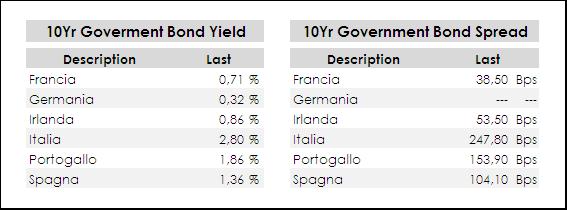 Leggermente più mossi i rendimenti dei benchmark decennali, così come gli spread contro Bund: cosa ovvia, poiché da qui in poi come detto saranno le rilevanze politiche a svolgere il compito di market mover, e potremmo anche assistere a nuove rappresaglie nei nostri confronti. Il decennale tedesco si porta verso area 0,30% di rendimento (0,32% attuale contro 0,40% della scorsa rilevazione), la Francia rimane stabile allo 0,71% l’Irlanda si porta a 0,86%. Per ciò che concerne i periferici, il nostro Btp sale al 2,80% di rendimento, il Portogallo sale a 1,86% e la Spagna sale all’1,36%. A livello di spread Vs Bund, tutti in salita, abbiamo Portogallo, Spagna e Italia rispettivamente a 154 bps, 104 bps e 248 bps.
