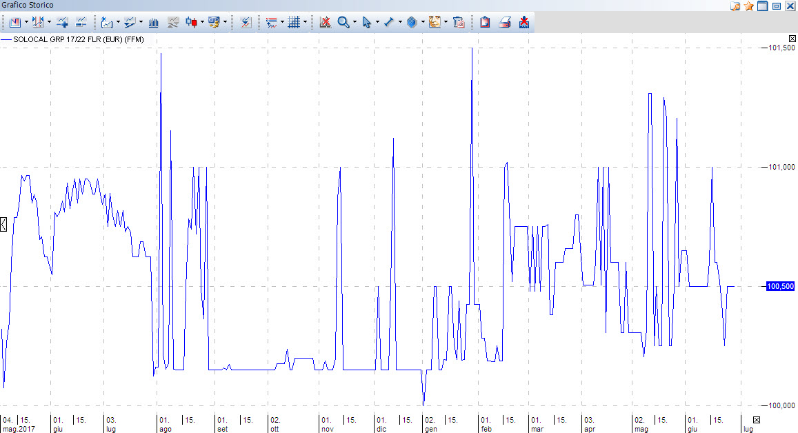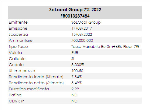 Il bond HY che analizziamo oggi è un tasso variabile della francese SoLocal Group. Il bond SoLocal Group (ex Pages Jaunes francesi) è il risultato del lungo processo di ristrutturazione del debito della società francese; collocata a 100 a metà 2017, ISIN FR0013237484, corrisponde una cedola a tasso variabile indicizzato all’Euribor 3 mesi con uno spread del 6% e un Floor del 7% pagabile il 15 marzo, 15 giugno, 15 settembre e 15 dicembre di ogni anno. Il rimborso è previsto in unica soluzione alla pari il 15 marzo 2022, salvo possibilità di richiamo anticipato secondo le clausole previste dal prospetto informativo. Il bond è senior secured ed è negoziabile su OTC per importi minimi di 1.000 Euro. La cedola attuale è ora all’8%, per cui superiore al Floor previsto originariamente, poiché vi sono diverse clausole a favore dell’obbligazionista che possono aumentare la cedola; rimandiamo al prospetto informativo (che tra l’altro è sempre cose buona leggere per i bond High Yield)per tutte le specifiche.