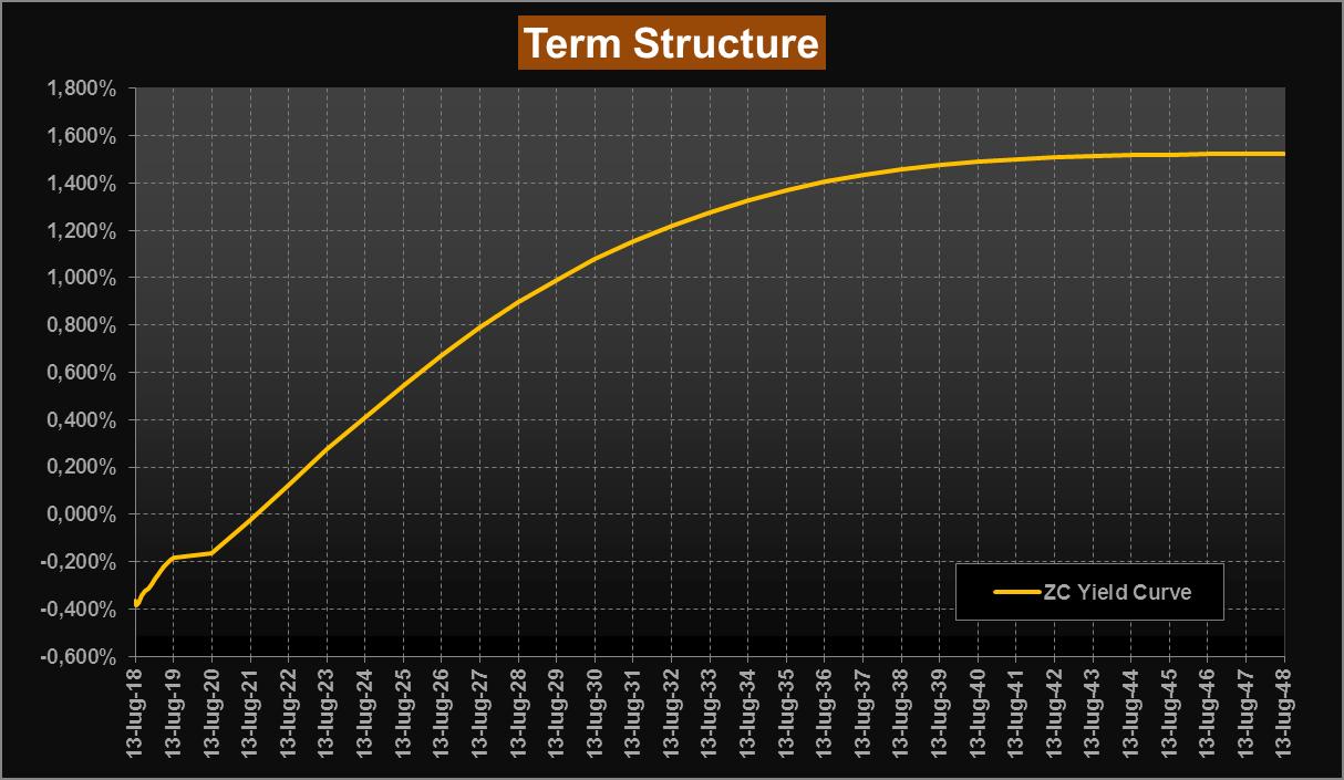 La nostra consueta lettura del mercato obbligazionario attraverso la ZC-Yield Curve, ci mostra questa settimana rendimenti impliciti praticamente immobili rispetto alla scorsa rilevazione. Sul tratto a lunga siamo sempre in area 1,50% per le scadenze dal 2040 per rimanervi poco sopra per le scadenze dal 2048; sulla scadenza a 10 anni siamo incollati ad area 0,90%. Stabile anche la parte a breve che mantiene la sua inclinazione come già osservata nelle precedenti analisi. immobili anche i forward su Euribor 6 mesi, che sul tratto a lunga permangono in area 2,05% e con conferma del lieve appiattimento sulla parte a breve già osservato in precedenza.