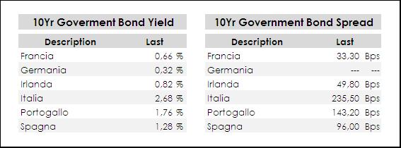 In lieve contrazione i rendimenti dei benchmark decennali, così come gli spread contro Bund. Il decennale tedesco rimane stabile in area 0,30% di rendimento (0,32% attuale contro 0,32% della scorsa rilevazione), la Francia rimane scende allo 0,66% l’Irlanda si porta a 0,82%. Per ciò che concerne i periferici, il nostro Btp scende al 2,68% di rendimento, il Portogallo cala a 1,76% e la Spagna scende all’1,28%. A livello di spread Vs Bund, tutti in contrazione, abbiamo Portogallo, Spagna e Italia rispettivamente a 143 bps, 96 bps e 235 bps.
