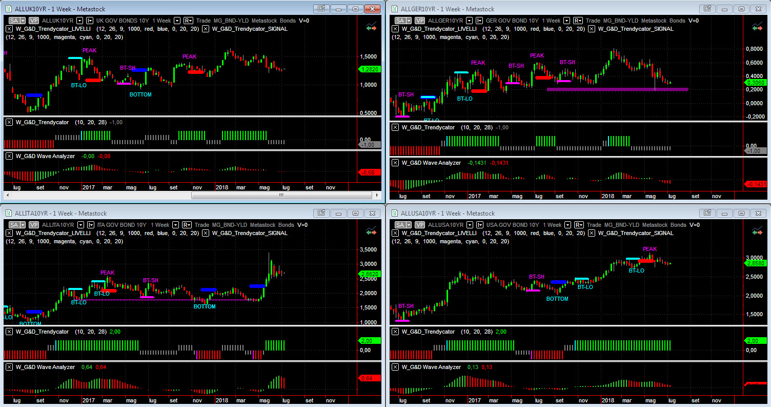 Osservando – a livello di analisi integrata – le curve dei rendimenti dei benchmark decennali dei principali mercati la situazione di medio/lungo è immutata. Trendycator rimane NEUTRAL sull’area UK così come risulta NEUTRAL sull’area BUND: l’area UK rimane intorno ad area 1,30% di rendimento , mentre il decennale tedesco staziona stabilmente in area 0,30%. In discesa il rendimento del nostro Btp che torna sotto area 2,70% e mantiene l’impostazione LONG di Trendycator (verde) per la settima settimana consecutiva. Prosegue anche il consolidamento per l’area USA, che dopo essersi allontanata un po’ da area 3% nelle scorse settimane gravita ora sempre poco sotto 2,90% e con Trendycator sempre saldamente al rialzisto.
