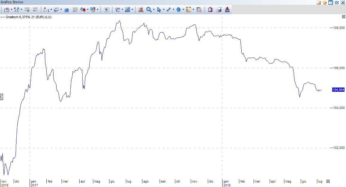 Il bond analizzato è il tasso fisso, collocato a 100 a fine 2016, ISIN XS1513691979, corrisponde una cedola annua del 6,375% pagabile semestralmente. Emesso per un ammontare di 320Mln Euro, rimborso previsto in unica soluzione alla pari il 07 novembre 2021, salvo possibilità di richiamo anticipato secondo le clausole previste dal prospetto informativo (qui il link per scaricarlo). Il bond è negoziabile su OTC e su EuroTlx per importi minimi di 100.000 Euro.