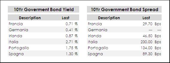 Poco evidenti i movimenti sui rendimenti dei benchmark decennali, così come sugli spread contro Bund. Il decennale tedesco allarga un po’ e si porta in area 0,40% di rendimento (0,41% attuale contro 0,34% della scorsa rilevazione), la Francia sale allo 0,71% e l’Irlanda si porta a 0,87%. Per ciò che concerne i periferici, il nostro Btp sale al 2,71% di rendimento, il Portogallo rimane a 1,75% e la Spagna va all’1,30%. A livello di spread Vs Bund, allarga in po’ l’Italia e quindi abbiamo Portogallo, Spagna e Italia rispettivamente a 134 bps, 89 bps e 230 bps.