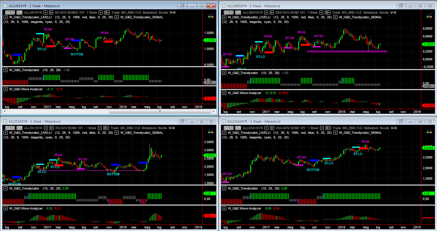 Osservando – a livello di analisi integrata – le curve dei rendimenti dei benchmark decennali dei principali mercati la situazione prospettica è sempre la stessa. Trendycator rimane NEUTRAL sia sull’area UK sia sull’area BUND: l’area UK sale un po’ e si porta a ridosso di area 1,30% di rendimento, mentre il decennale tedesco va a lambire area 0,40%. In lieve salita anche il rendimento del nostro Btp che si riavvicina ad area 2,70% e mantiene l’impostazione LONG di Trendycator (verde) per la nona settima settimana consecutiva. Prosegue stabile e imperturbabile il consolidamento per l’area USA, che dopo aver tirato un po’ il fiato è ora nuovamente a ridosso di area 3% di rendimento con Trendycator sempre rialzista.