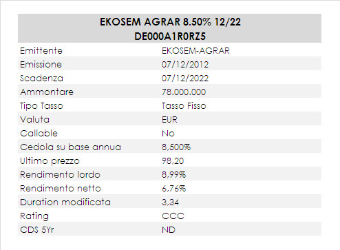 Il bond HY che analizziamo oggi è un tasso fisso della tedesca Ekosem-Agrar. L’azienda è la holding tedesca della società agricola russa EkoNiva-APK, una delle più grandi aziende agricole russe. La Ekosem-Agrar gestisce un totale di oltre 300.000 ettari di terreno e ha poco meno di 100.000 bovini. Con una produzione giornaliera di 1.000 tonnellate di latte, la società è attualmente il maggior produttore di latte della Russia. Il settore è piuttosto rischioso e l’esposizione verso il Rublo non va trascurata; anche a livello di Credit Risk l’emittente è tra i più rischiosi e quindi questo Hygh Yield va trattato con estrema cautela, anche in ragione dell’emissione piuttosto piccola.