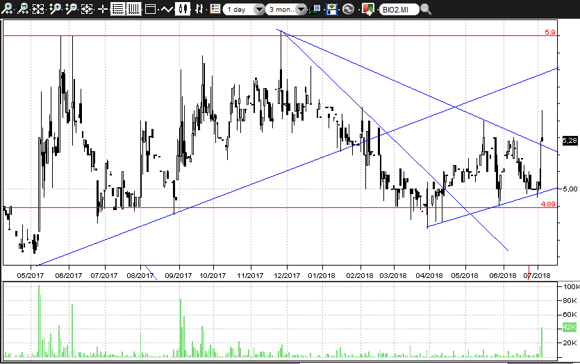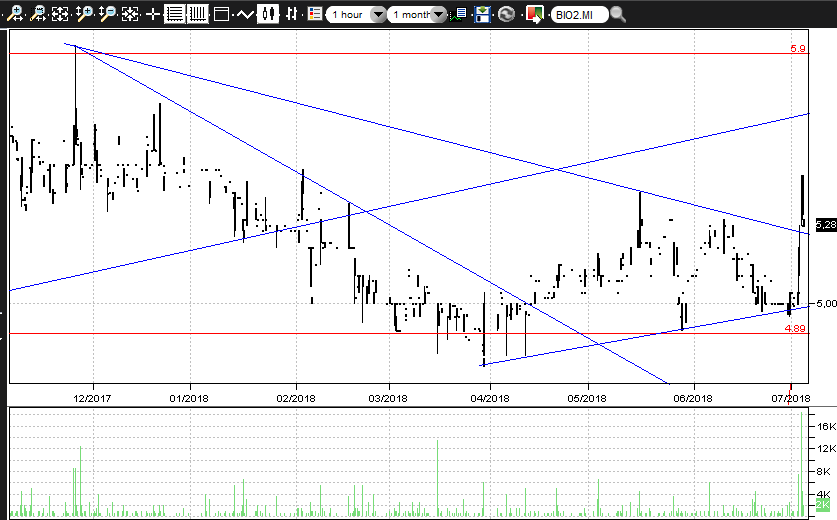 Passando all'analisi tecnica, come si può vedere dal grafico orario, dopo aver ristagnato sui 5 €, c'è da riportare un rinnovato interesse, segnalato opportunamente dal ritorno di un discreto volume di contrattazione.