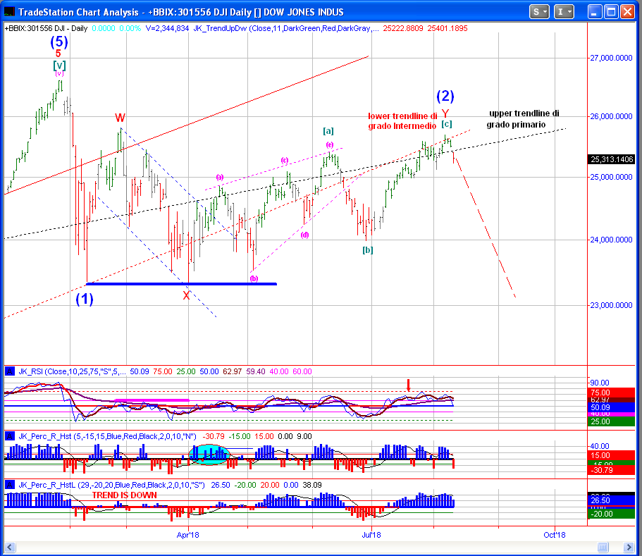 Gli ultimi rialzi e gli ultimi nuovi massimi a cui abbiamo assistito si sono verificati grazie a un pugno di aziende (Amazon, Netflix, Apple, Facebook e Google) che da sole hanno inciso al 98% sull’avanzamento dell’intero mercato americano dalla fine di luglio ad oggi. Ovviamente questi nuovi massimi ci costringono a rivedere l’etichettatura delle nostre onde che ora sul Dow Jones si può interpretare come sotto riportato: