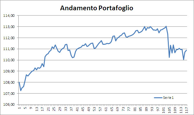 Così, ai prezzi correnti di mercato il nostro NAV vale oggi 110,87 rispetto ai 110,72 dell’ultima valorizzazione e francamente ci aspettiamo di aver ripreso la via di un recupero costante. Scorsa settimana è andato a scadenza il Btp-i 1,70% 2018 (primo rimborso di una lunga serie che ci terrà compagnia per i prossimi 3 mesi) il quale pesava parecchio e infatti ora ci troviamo con 20.000 Euro di liquidità che ci fanno proprio comodo.
