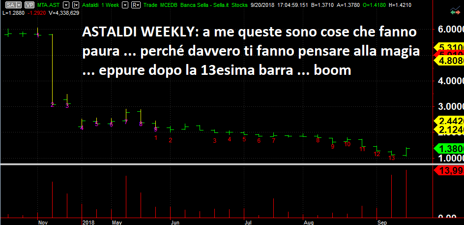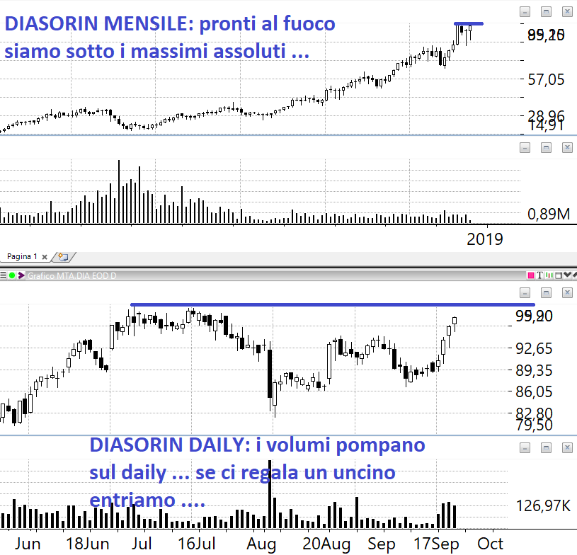 Di titoli da comprare ce ne sono a dozzine. Ma aspettiamo che entrino i target di Fineco Aeffe e Mutui On Line. Non andiamo in sovra-esposizione di titoli senza avere il coltello dalla parte del manico. Qui sale tutto e non si capisce il perché ma la Borsa sa sempre più di noi. C'è un Sequential sul VIX daily che è arrivato a 12 e inoltre il Money Flow sta arrivando ai massimi della banda di oscillazione (non vuole dire niente se non che non siamo più in zona Cesarini, se fosse al top per qualche settimana ovviamente dovrebbe scendere ma se ci è arrivato e ci rimane a noi fa solo comodo). Qui conta solo il risk management. Quindi aspettiamo e tiriamo per il momento il freno a mano. Qualche idea per chi invece sa fare da solo e magari è più bravo di noi.