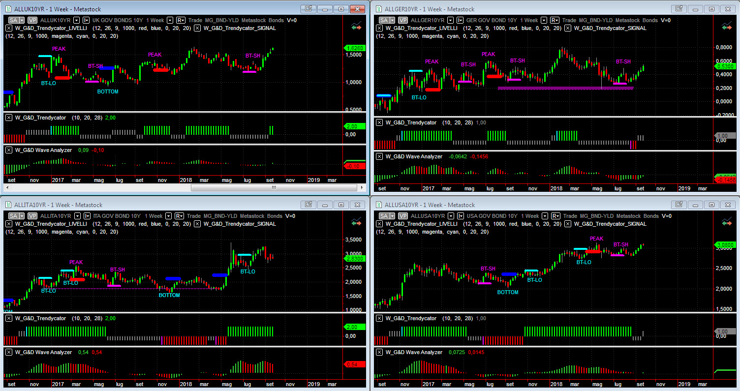 Come dicevamo, sulle curve dei rendimenti impliciti non vi sono state evidenti variazioni, e osservando – a livello di analisi integrata – le curve dei rendimenti dei benchmark decennali dei principali mercati la situazione prospettica si conferma intonata ad un rialzo dei rendimenti. L’area UK sale ancora e si porta oltre area 1,60% di rendimento, mentre il decennale tedesco supera area 0,50%. In altalena il rendimento del nostro Btp che si muove nell’intervallo 2,70%-2,80% con Trendycator sempre LONG (verde). Stabile l’area USA che ha riconquistato area 3% di rendimento con Trendycator confermato in zona neutrale.