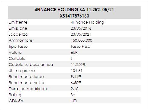 Il bond HY che analizziamo oggi è un titolo emesso da 4Finaca SA, uno dei maggiori gruppi di credito al consumo digitale in Europa con attività in 15 paesi. Fondata nel 2008, facendo leva su un elevato grado di automazione, la società è cresciuta rapidamente erogando complessivamente oltre 5 Mld Euro di prestiti sia a pagamento unico sia prestiti rateali e linee di credito dall'inizio della sua attività. Stando a quanto dichiarato dalla società, 4Finance gestisce un portafoglio di marchi leader del mercato, attraverso i quali, in qualità di erogatore responsabile, è in grado di offrire prodotti semplici, convenienti e trasparenti a milioni di clienti che sono tipicamente sottovalutati dai fornitori convenzionali. 4Finance attualmente opera in 13 paesi in Europa, oltre ad Argentina e Messico; il gruppo offre inoltre depositi, oltre a prestiti per consumatori e PMI attraverso la sua controllata TBI Bank, un'istituzione con licenza UE con attività in Bulgaria e Romania.