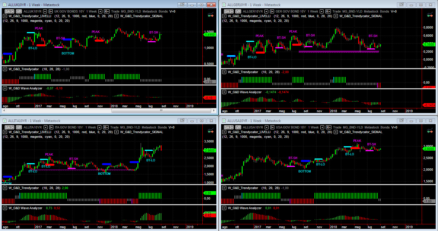 Osservando – a livello di analisi integrata – le curve dei rendimenti dei benchmark decennali dei principali mercati la situazione prospettica inizia a mostrare qualche piccola variazione. Trendycator rimane NEUTRAL sull’area UK ma si pone al ribasso sull’area BUND, cosa che non succedeva dal 2016. L’area UK sale un po’ e si porta a ridosso di area 1,40% di rendimento, mentre il decennale tedesco pur rimanendo in area 0,40% inizia a mostrare debolezza. Probabile che tale evidenza sia solo dovuta ai “giochi” sullo spread per quanto detto sopra, poiché se confermata tale impostazione prospetterebbe un rendimento del Bund in forte contrazione che francamente è poco aderente alle evoluzioni attese per il mercato obbligazionario. Ovviamente in salita il rendimento del nostro Btp che si assesta poco sotto il 3% dopo essersi riproposto verso i massimi precedenti in area 3,25%; sempre LONG l’impostazione di Trendycator (verde). Prosegue di fatto il consolidamento per l’area USA, sempre nell’intorno di area 3% di rendimento con Trendycator ora in zona neutrale.