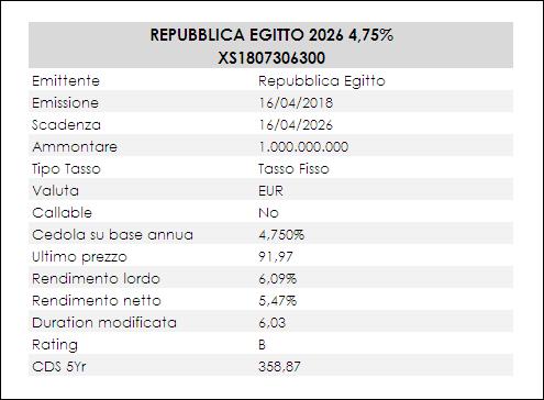 Il bond HY che analizziamo oggi è un titolo governativo emesso dalla Repubblica dell’Egitto. Il Paese sta affrontando una situazione non semplice anche se il Governo già da qualche tempo ha messo in pratica alcune manovre per cercare di favorire l’attività economica. Purtroppo non abbiamo dati molto recenti a livello macro e possiamo riferirci solo a quanto disponibile ad oggi.