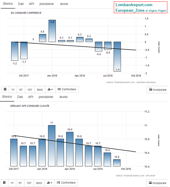 La musica anche in questo caso non cambia: la Germania sicuramente meglio dell’euro-area, ma in ogni caso siamo sempre su sempre una tendenza ribassista. Con questi indicatori che puntano tutti uniformemente al ribasso non si capisce come faccia Draghi a pensare di aver vinto la battaglia sull’inflazione al 2%. Ammesso che il dato sia anche buono staremo a vedere se sarà un dato duraturo o passeggero.
