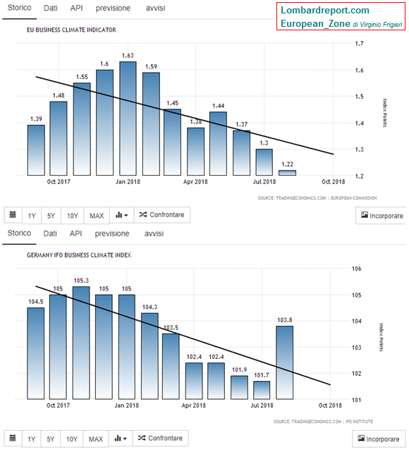 Anche in questo caso la tendenza è al ribasso e da Gennaio a luglio è stata quasi sempre discesa; recupera energicamente la Germania in Agosto, ma bisognerà vedere se tiene. Il prossimo grafico mostra l’indice ZEW di sentiment sull’economia: