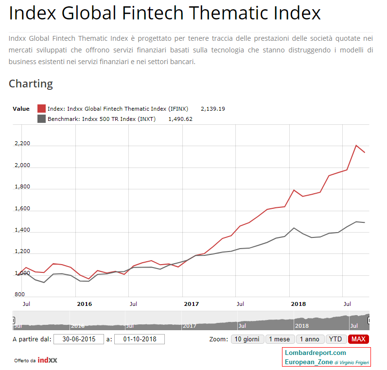 Un altro benefattore del fiorente ottimismo della società è sicuramente il settore della tecnologia finanziaria (fintech).Il Global Fintech Thematic Index è l'indice che replica le performance delle società che offrono servizi finanziari basati sulla tecnologia che stanno distruggendo i modelli di business tradizionali nei servizi finanziari e nei settori bancari.