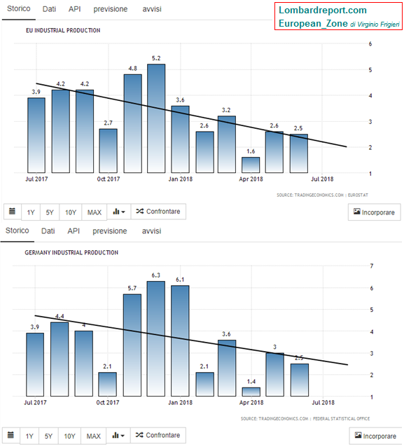 In questo grafico vediamo l’andamento della produzione industriale dei paesi dell’Euro Area sopra e della sola Germania sotto. In entrambi i casi si raggiunge il massimo a dicembre dello scorso anno e poi inizia il tracollo; la Germania ovviamente resiste di più e a gennaio mostra ancora un dato buono mentre l’euro area perde già quasi due punti ma in entrambi i casi la tendenza (linea nera continua) è al ribasso.